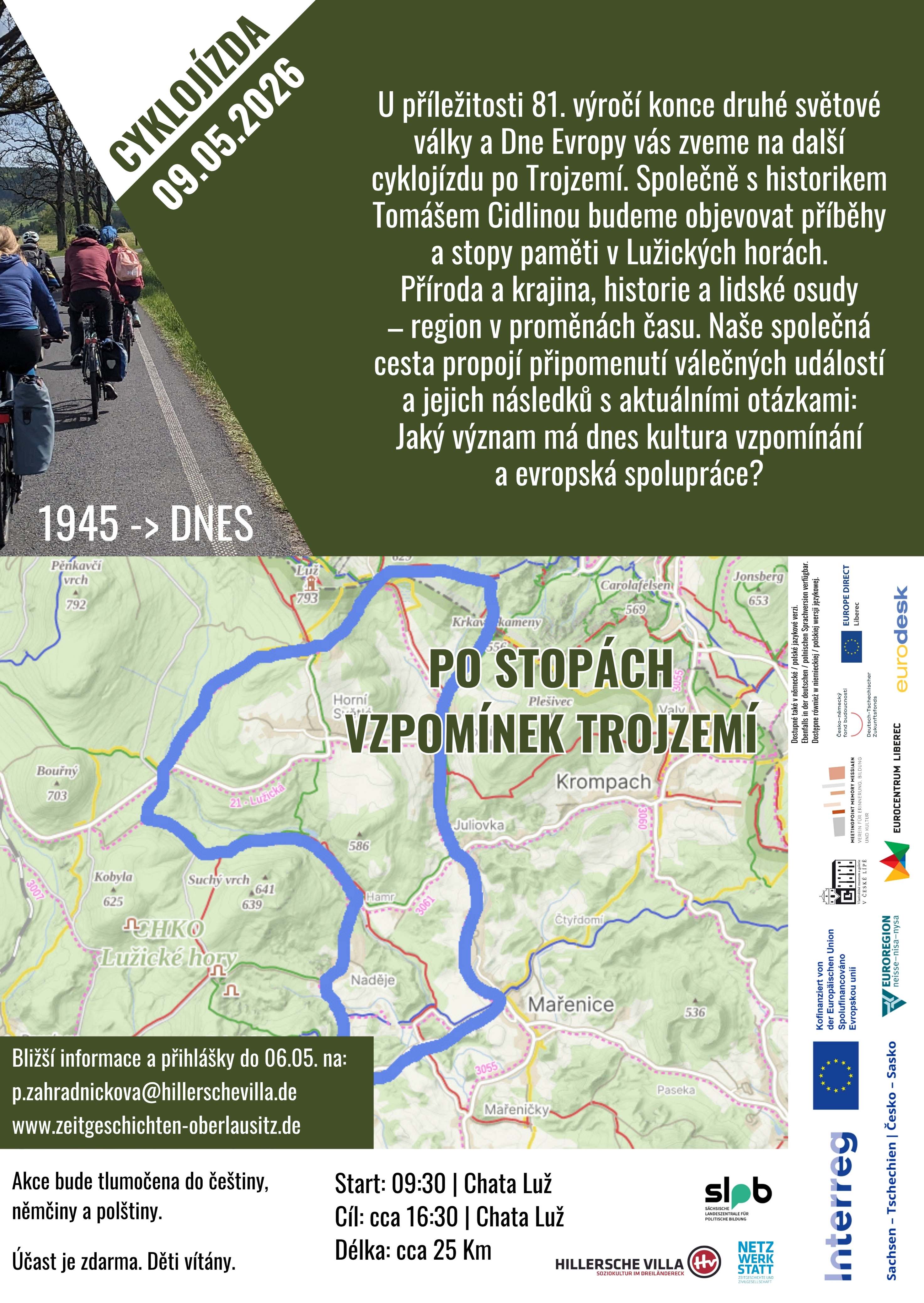 U příležitosti 81. výročí konce druhé světové války a Dne Evropy vás zveme na další cyklojízdu po Trojzemí. Společně s historikem Tomášem Cidlinou budeme objevovat příběhy a stopy paměti v Lužických horách.