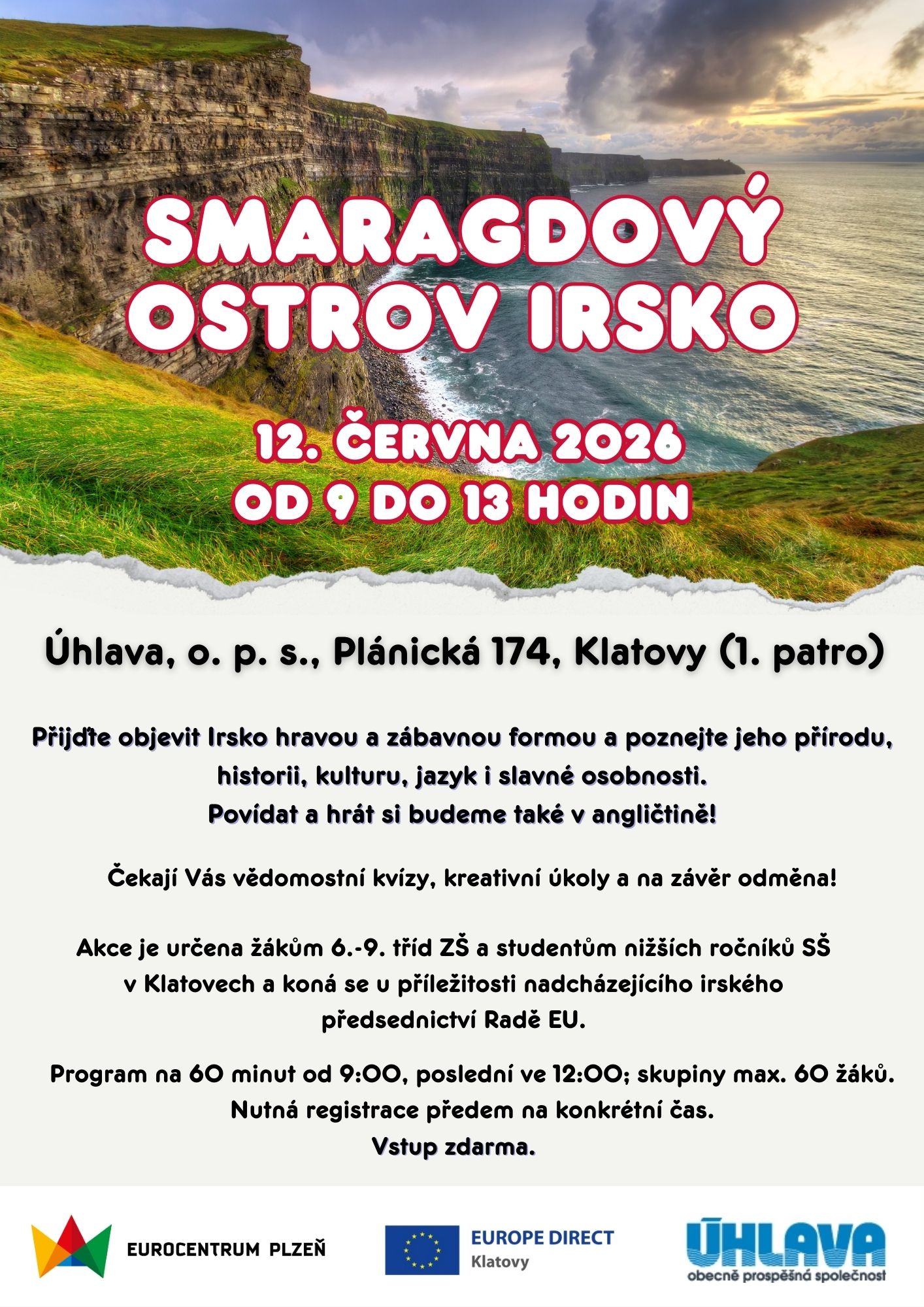 EUROPE DIRECT Klatovy, Eurocentrum Plzeň a Úhlava, o.p.s., zve všechny žáky 6.-9. tříd ZŠ a nižších ročníků SŠ na zábavně-vzdělávací program Smaragdový ostrov Irsko.