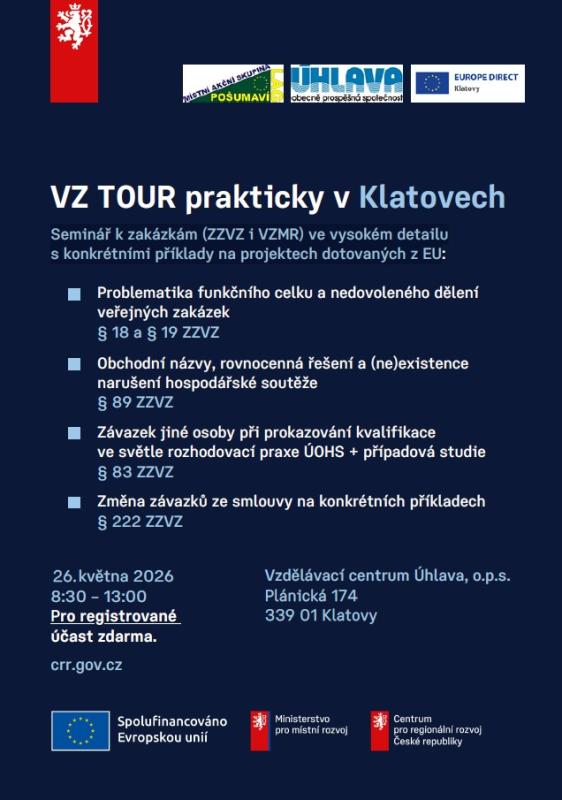 Zveme Vás na seminář k zakázkám (ZZVZ i VZMR) ve vysokém detailu s konkrétními příklady na projektech dotovaných z EU, který spolupořádáme ve Vzdělávacím centru Úhlava, o.p.s., v Klatovech dne 26. května 2026 od 9:00 hod.